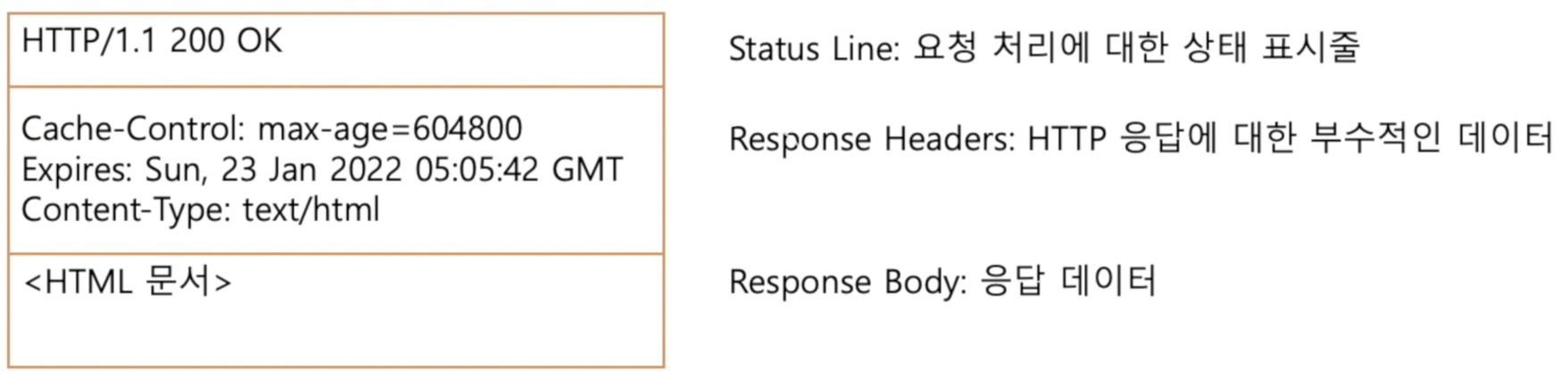 - 헤더에 있는 정보로는 응답의 내용이 HTML이라는 걸 알 수 있는 내용이 있고, 실제 HTML의 내용은 바디에 들어감