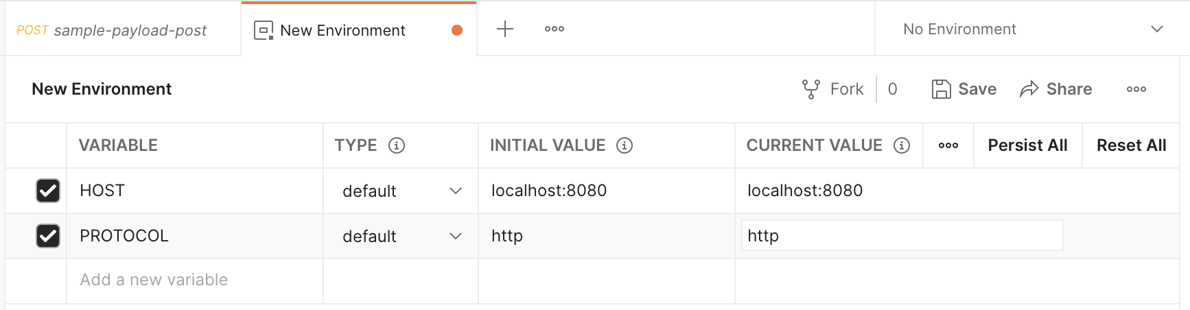 이렇게 설정했을 때의 장점: host, protocol 등을 바꿔서 테스트할 때 url 전체를 수정할 필요 없이 environment 설정만 바꿔주면 됨