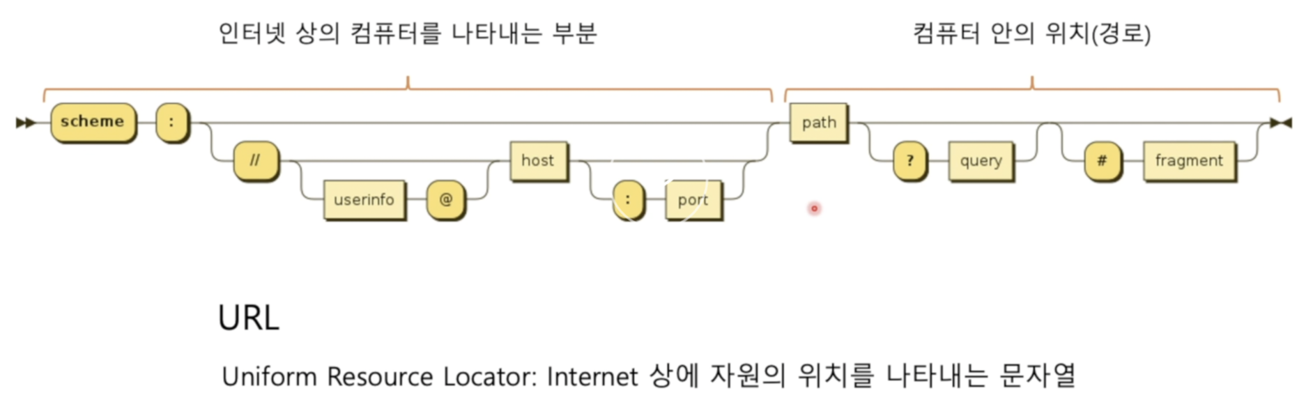- userinfo @: 선택사항. scheme에 따라 필요할수도 있고 아닐 수도 있음. 이메일 주소에서 주로 볼 수 있음.