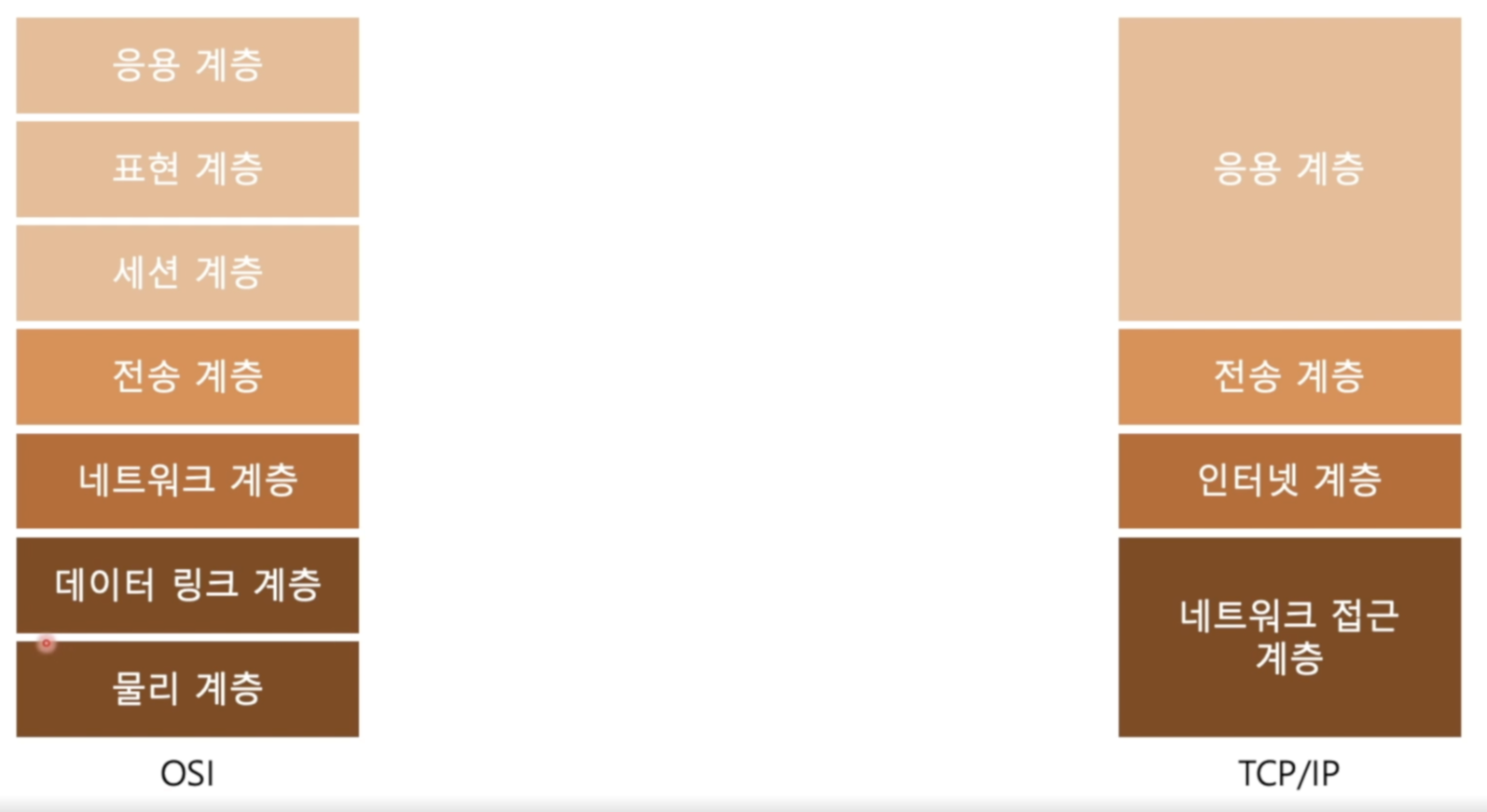 - 네트워크 접근 계층: 컴퓨터의 랜카드, 모뎀 같은 부분에서 일어남