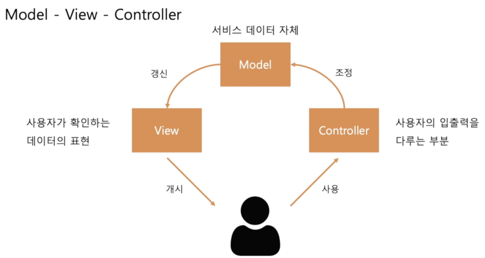 - 사용자가 view에서 어플리케이션이 작동하는 모습을 확인 > controller를 사용해 사용자가 명령 전달 > controller를 통해 model을 조정(작업 진행) > model이 controller에서 지시받은 내용을 가지고 view를 갱신