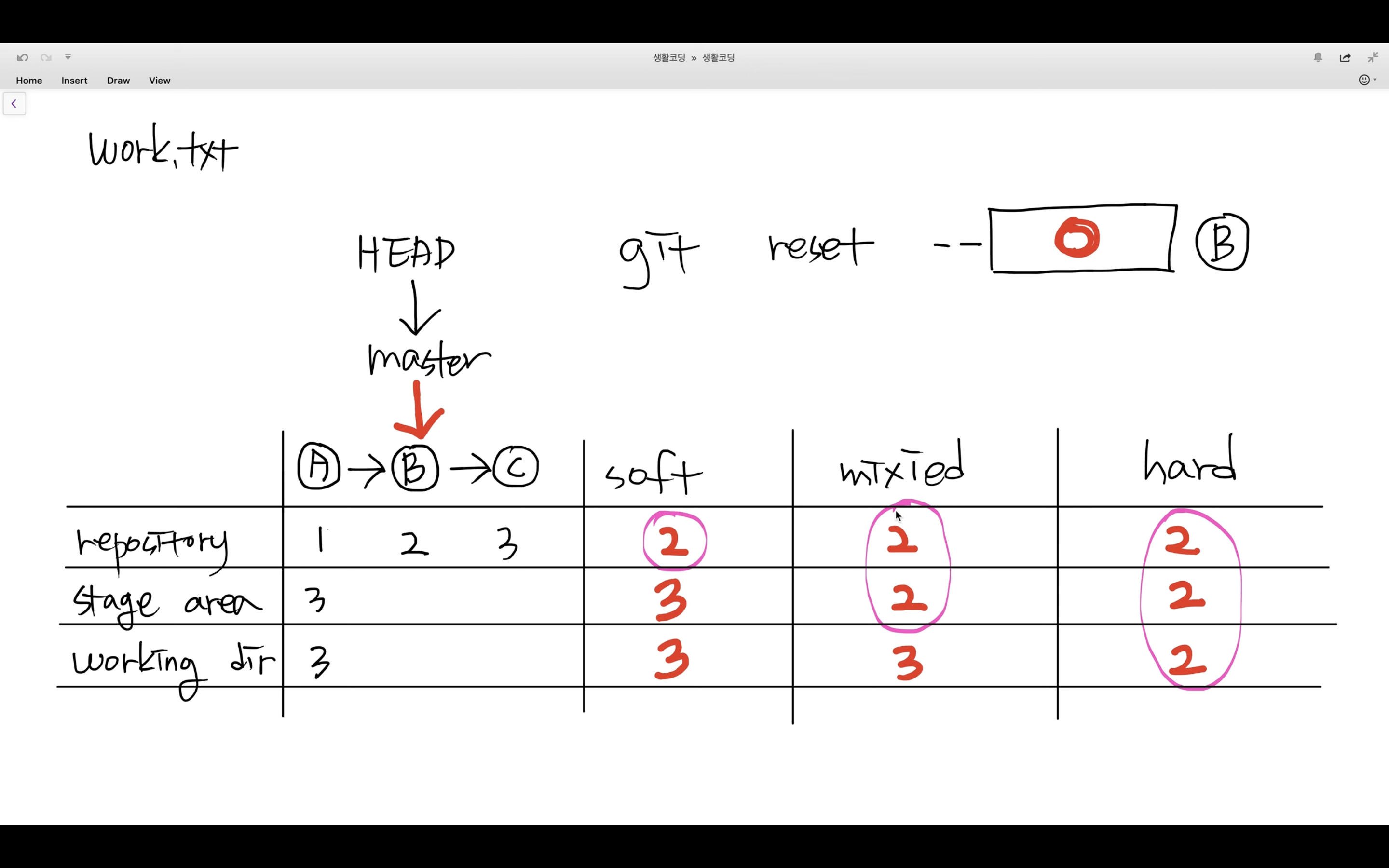 - git reset master 하면 master가 가리키는 버전을 가리키라는 뜻 (변화 없음)