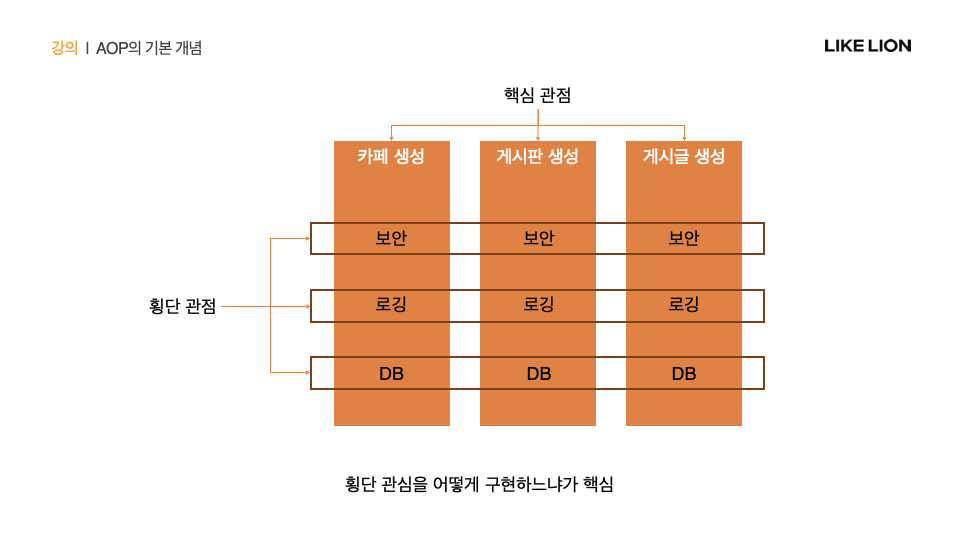 Aspect Oriented Programming: 서로 다른 비즈니스 로직이 공통적으로 가지는 관심(횡단 괸심)에 대하여 고민하는 개발 지향