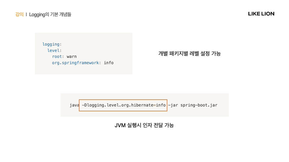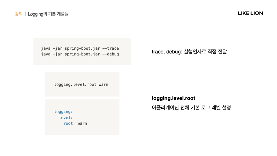 log level은 애플리케이션을 실행하면서 값을 설정해줄 수 있음. default는 info. 설정한 로그레벨 보다 >=인 메세지만 출력 (스프링부트의 default는 info이므로 trace, debug는 출력되지 않음)