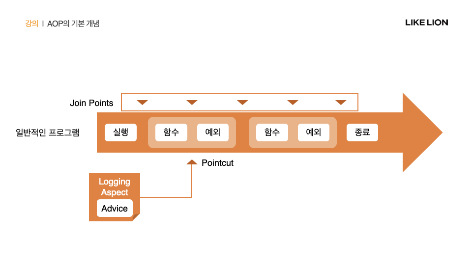 - Pointcut: 어떤 joint point에 logging aspect를 적용할 것인지
