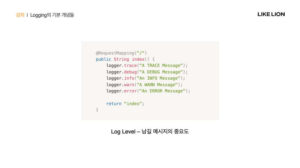 Log Level: logger를 통해 작성하고자 하는 메시지의 중요도 또는 위험도. trace<debut<info<warn<error 순