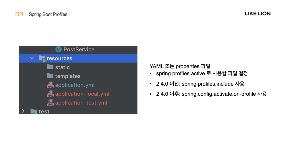 - 어떤 profile이 active한지 (어떤 profile을 사용해서 이 application을 실행할지) 설정 파일 안에서 정의