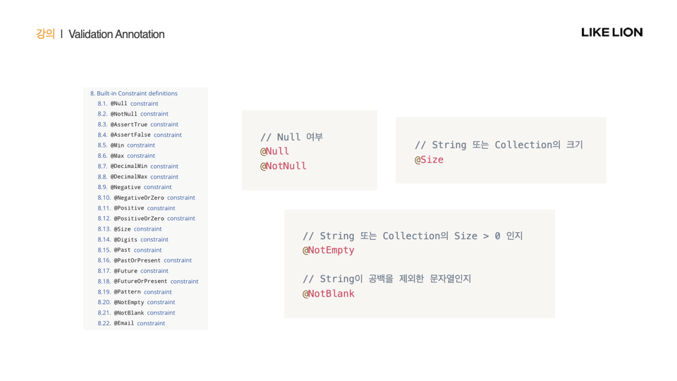 String 같은 데이터타입 뿐 아니라, 내부의 멤버변수로서 다른 클래스를 사용할 수도 있음 그럴 때는 그 클래스도 @Valid를 붙여 객체에 대한 검증을 진행할 수 있음